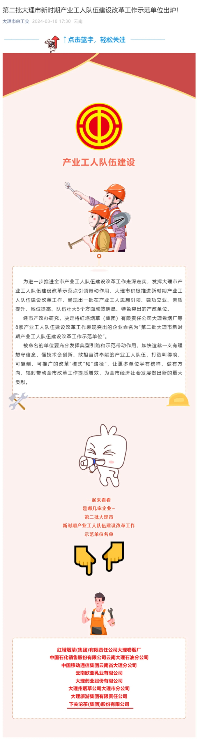 近日,大理市新時期產業(yè)工人隊伍建設改革工作領導小組辦公室(大理市總工會)發(fā)布了《關于命名第二批大理市產業(yè)工人隊伍建設改革示范單位的決定》,下關沱茶集團公司位列示范單位名單中。?以上截選自大理市總工會微信公眾號近年來,在大理州市總工會及相關部門指導下,我公司根據產改工作的總體部署要求,緊密結合生產經營管理實際,圍繞強化基...
