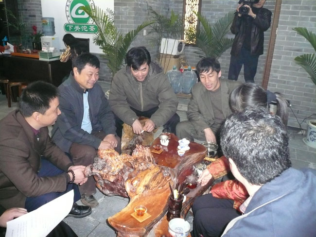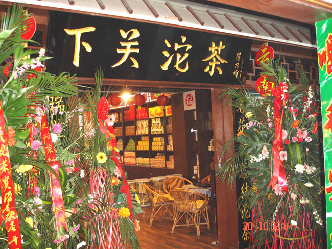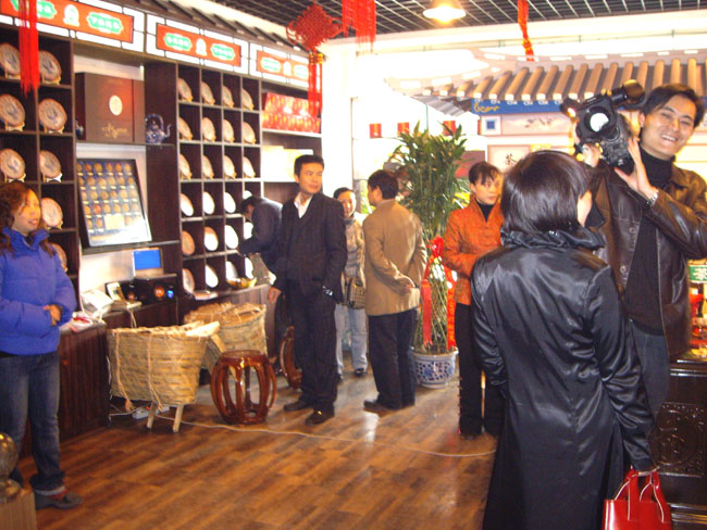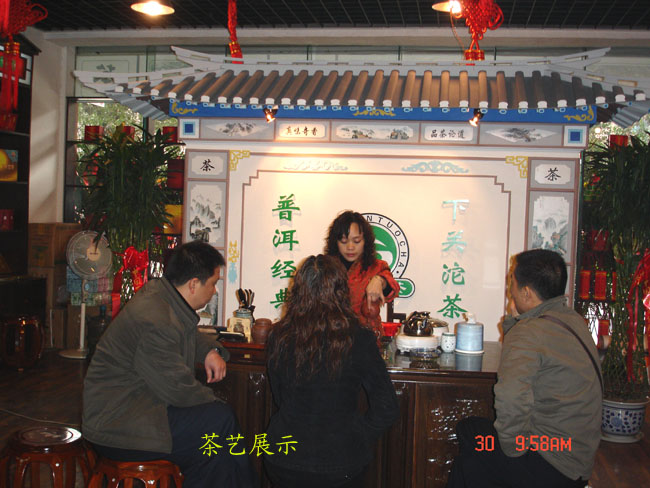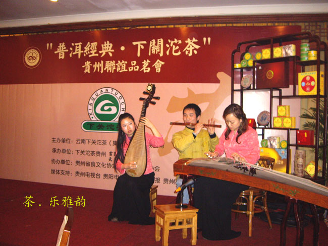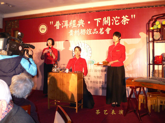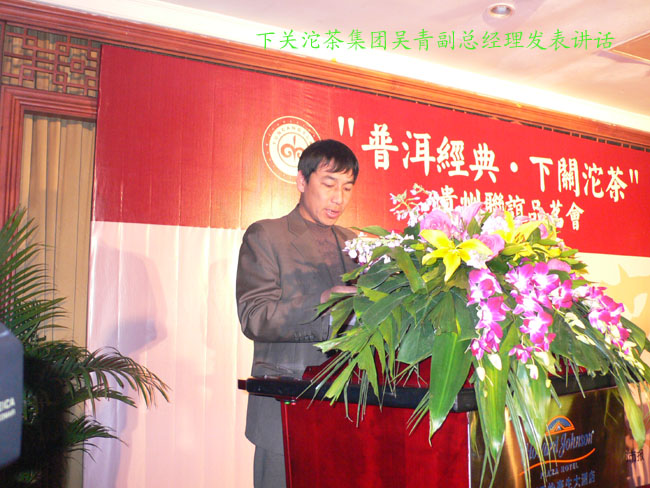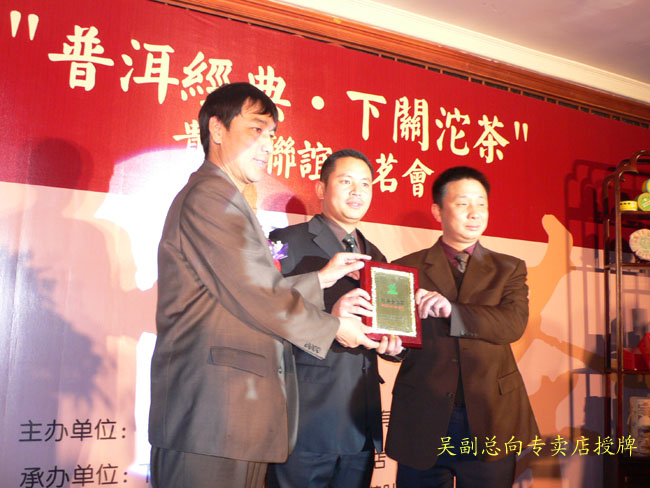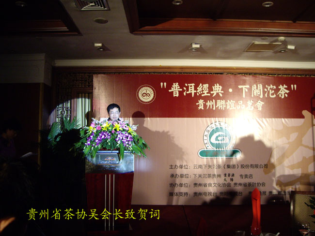 下午三點半兩家專賣店在貴陽天怡豪生大酒店舉行“百年經典.下關沱茶”貴州聯誼品茗會。會場張燈結彩.布置華麗,氣氛熱烈,兩百多名嘉賓參加會議。原貴州省長王朝文向大會發來賀信,原貴州省委副書記.省政協主席龍志毅,原貴州省軍區司令員陳慶云將軍,原貴州省政協副主席陳天賦等老同志參加會議。貴州省民委,省文化廳,省科協,省教育廳,貴州茶葉協會,貴州食文化協會負責人參加品茗會。下關沱茶集團公司副總經理吳青到會祝賀,并向兩家專賣店授牌。會上茶藝師為嘉賓們作茶藝表演,向嘉賓們展示下關沱茶系列產品,并讓嘉賓們品嘗下關沱茶。貴州省著名書畫家親自為兩家專賣店題字作畫。“黔水甜美浸普洱,沱茶淳香進萬家”寫出了到會嘉賓肺腑之言。貴州電視臺. 貴陽電視臺. 貴州都市報. 貴陽晚報. 貴州商報等新聞媒體派出多名記者到場采訪并跟蹤報導。