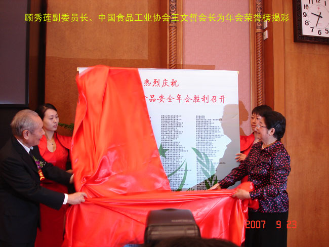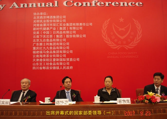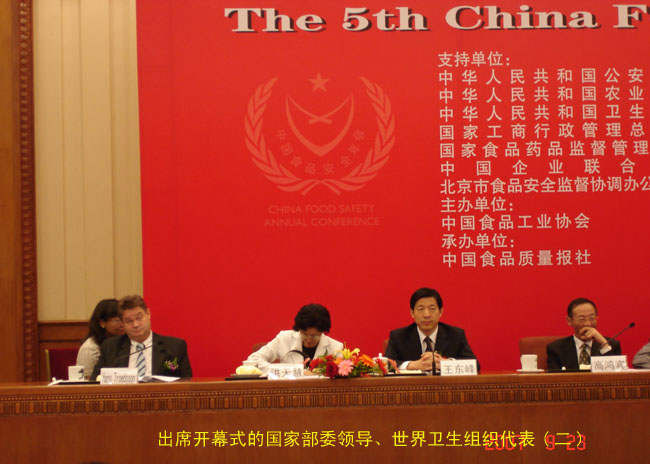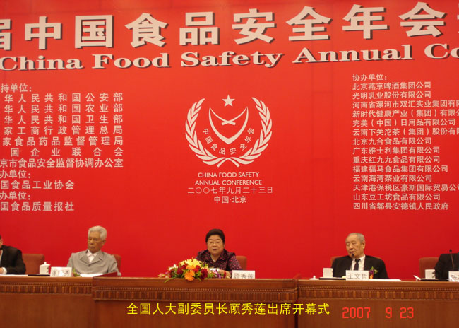出席9月23日上午的中國食品安全年會(huì)開幕式的國家領(lǐng)導(dǎo)人有:全國人大常委會(huì)副委員長顧秀蓮,公安部副部長劉金國、農(nóng)業(yè)部副部長高鴻賓、衛(wèi)生部副部長陳嘯宏、國家食品藥品監(jiān)督管理局副局長惠魯生、國家工商行政管理總局副局長王東峰等領(lǐng)導(dǎo)。原定出席開幕式的中央政治局委員、國務(wù)院副總理吳儀因公務(wù)未能出席,也給大會(huì)發(fā)來賀電“祝第五屆中國食品安全年會(huì)圓滿成功!”,在開幕式上,顧秀蓮副委員長在會(huì)上作了“讓人民分享食品安全福祉”的重要講話。