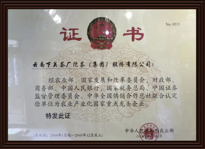 日前,國家農(nóng)業(yè)農(nóng)村部聯(lián)合發(fā)改委、商務(wù)部、中國人民銀行、證監(jiān)委、中華全國供銷合作總社公布了“第十次監(jiān)測合格和遞補(bǔ)農(nóng)業(yè)產(chǎn)業(yè)化國家重點(diǎn)龍頭企業(yè)名單”,下關(guān)沱茶集團(tuán)公司名列其中,這也是下關(guān)沱茶集團(tuán)獲得該資格認(rèn)定的第二十年。